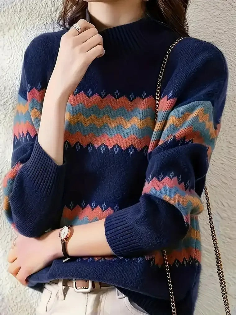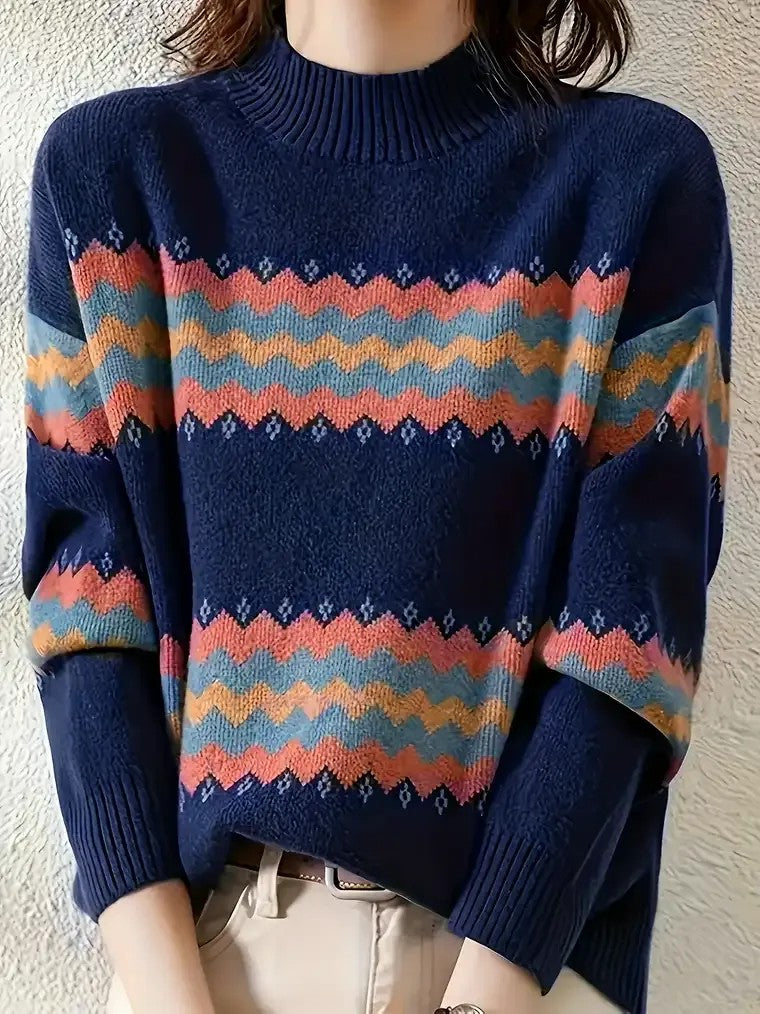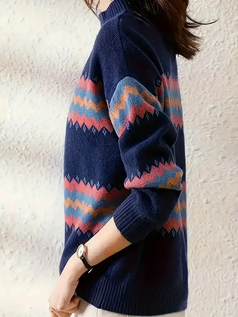 De Noa Trui brengt comfort en verfijning samen in één prachtig ontwerp. De hoge colkraag houdt je heerlijk warm op koude dagen, terwijl de horizontale zigzagstrepen en subtiele ruitmotieven zorgen voor een speels en vrouwelijk patroon. De zachte tinten en geribde afwerking aan de manchetten en zoom geven de trui een elegante, cozy uitstraling. Perfect voor het najaar en de winter — draag Noa met je favoriete jeans of rok voor een moeiteloos stijlvolle look.
