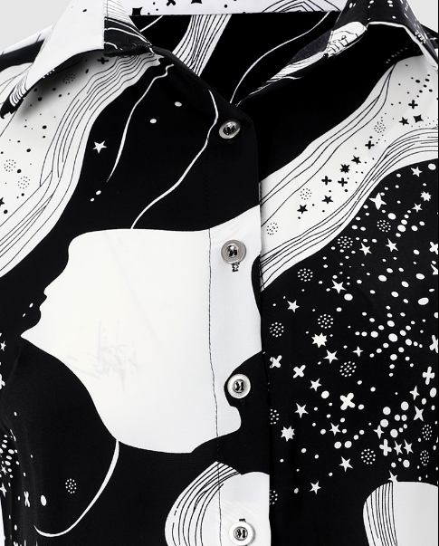 Tijdloos ontwerp, unieke druk: Deze blouse combineert moeiteloos een geraffineerd ontwerp met een betoverende druk, waardoor het een echte hebbeding is voor modebewuste vrouwen. De klassieke combinatie wit-zwart straalt tijdloze schoonheid uit, terwijl de buitengewone afdruk originaliteit toevoegt aan je kleding.